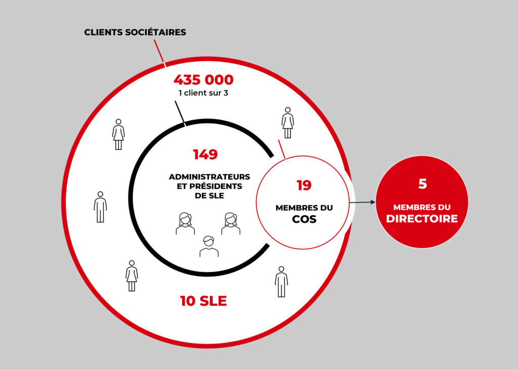 - Le COS (Conseil d’Orientation et de Surveillance) est composé de 19 membres dont 15 administrateurs de SLE, tous élus et représentant les clients sociétaires. Le COS valide les orientations proposées, veille à la bonne mise en œuvre des politiques décidées et contrôle la gestion de la banque.